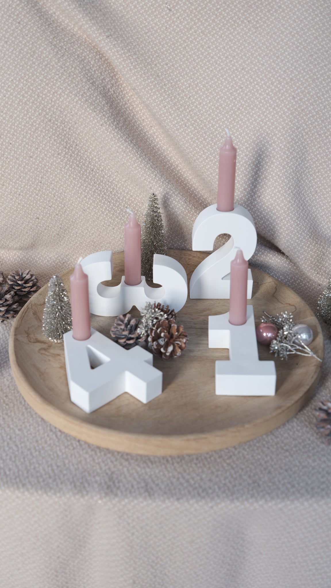 Die Zahlen von eins bis vier als Kerzenständer inkl. vier kleinen Stabkerzen mit salbei oder rosa, ohne weitere Deko.