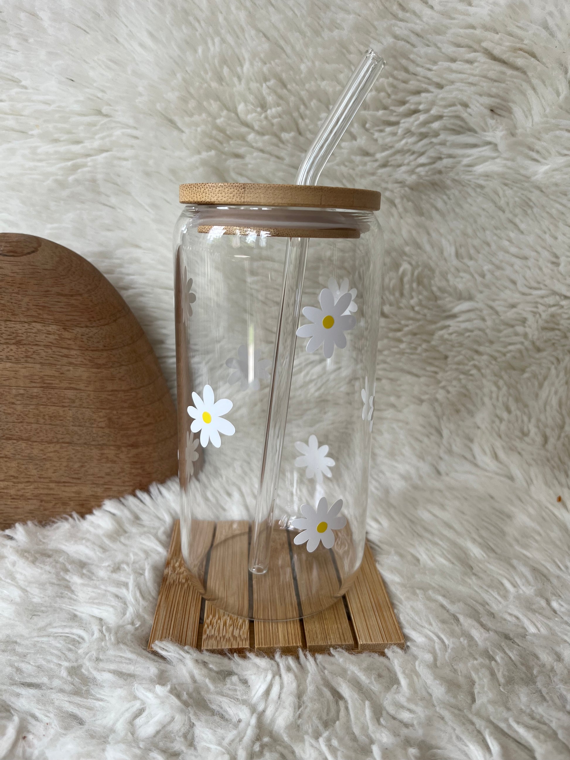 Trinkglas „Blumen“ mit Deckel und Strohhalm