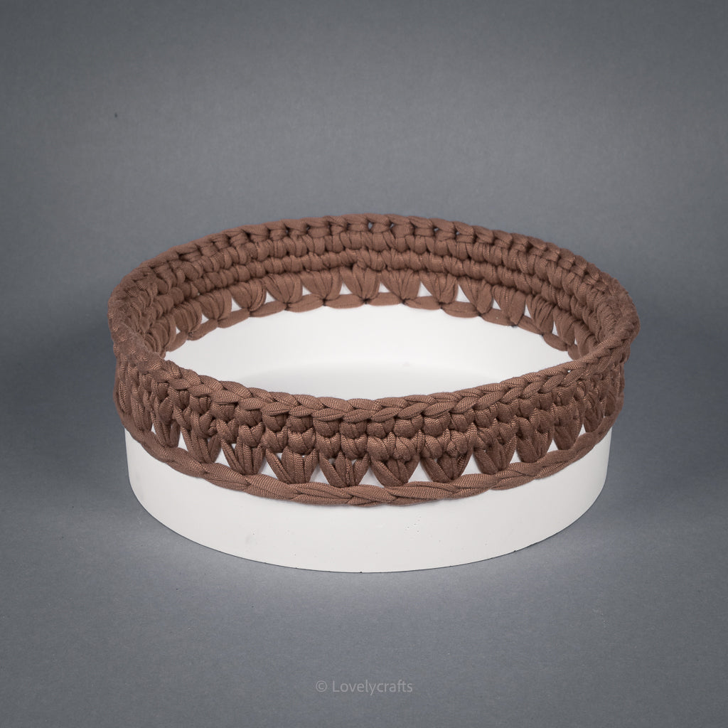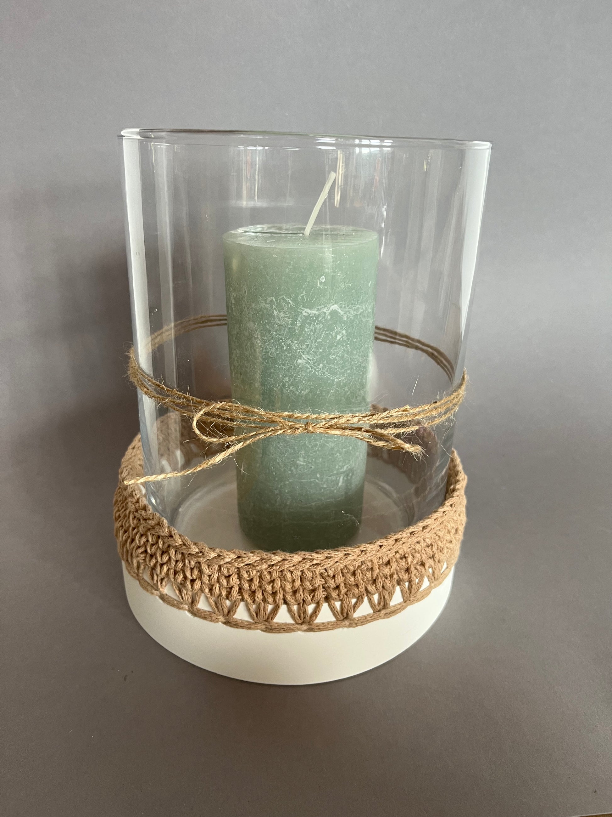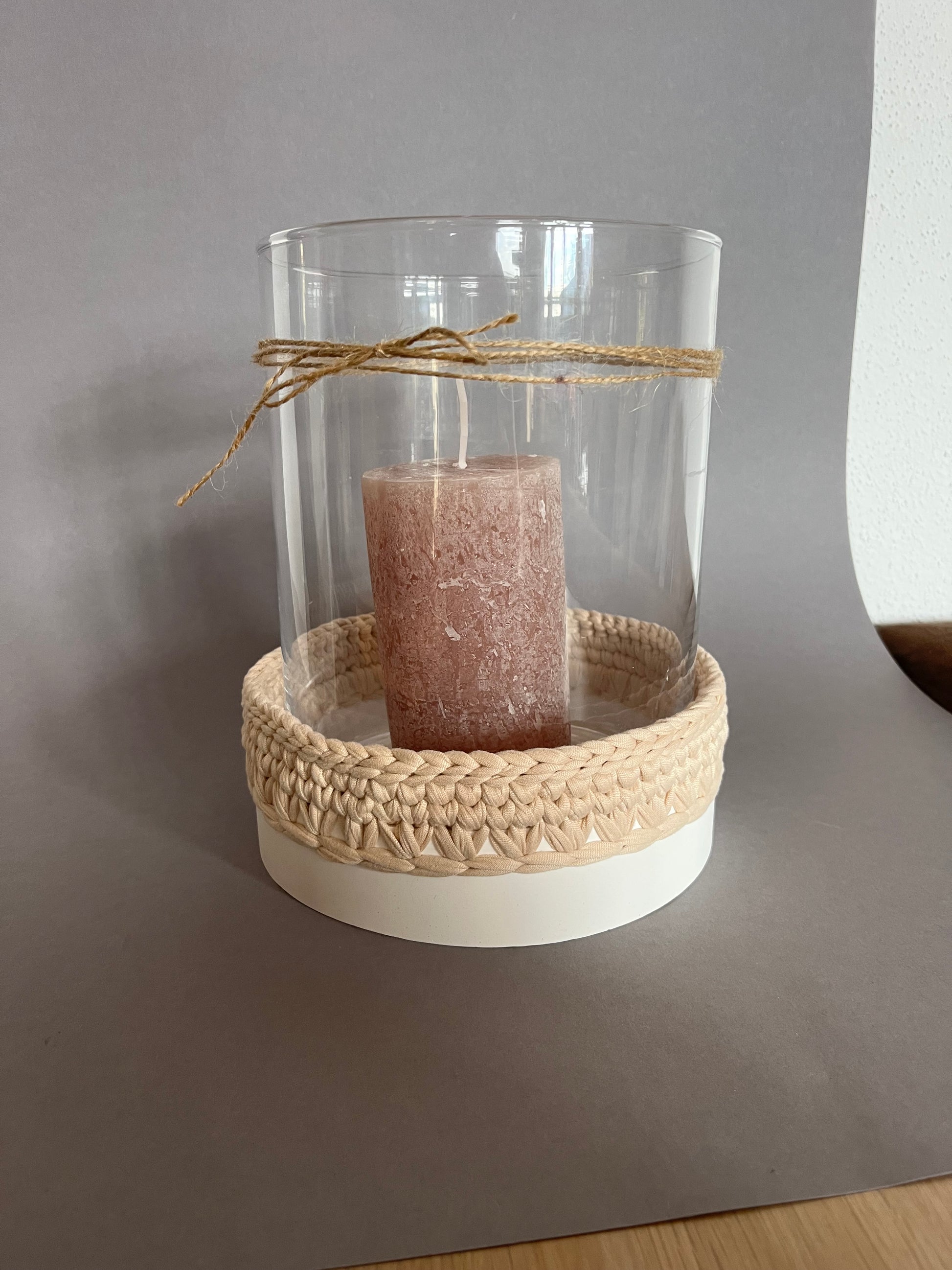 Gegossene Schale aus Raysin mit einem Häkelrand in braun oder beige. Glaszylinder und einer Kerze.
