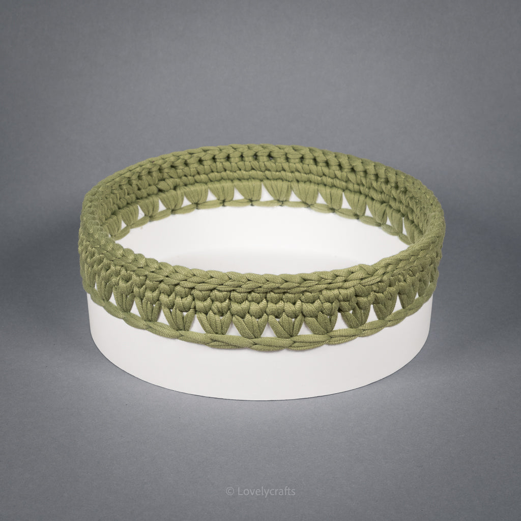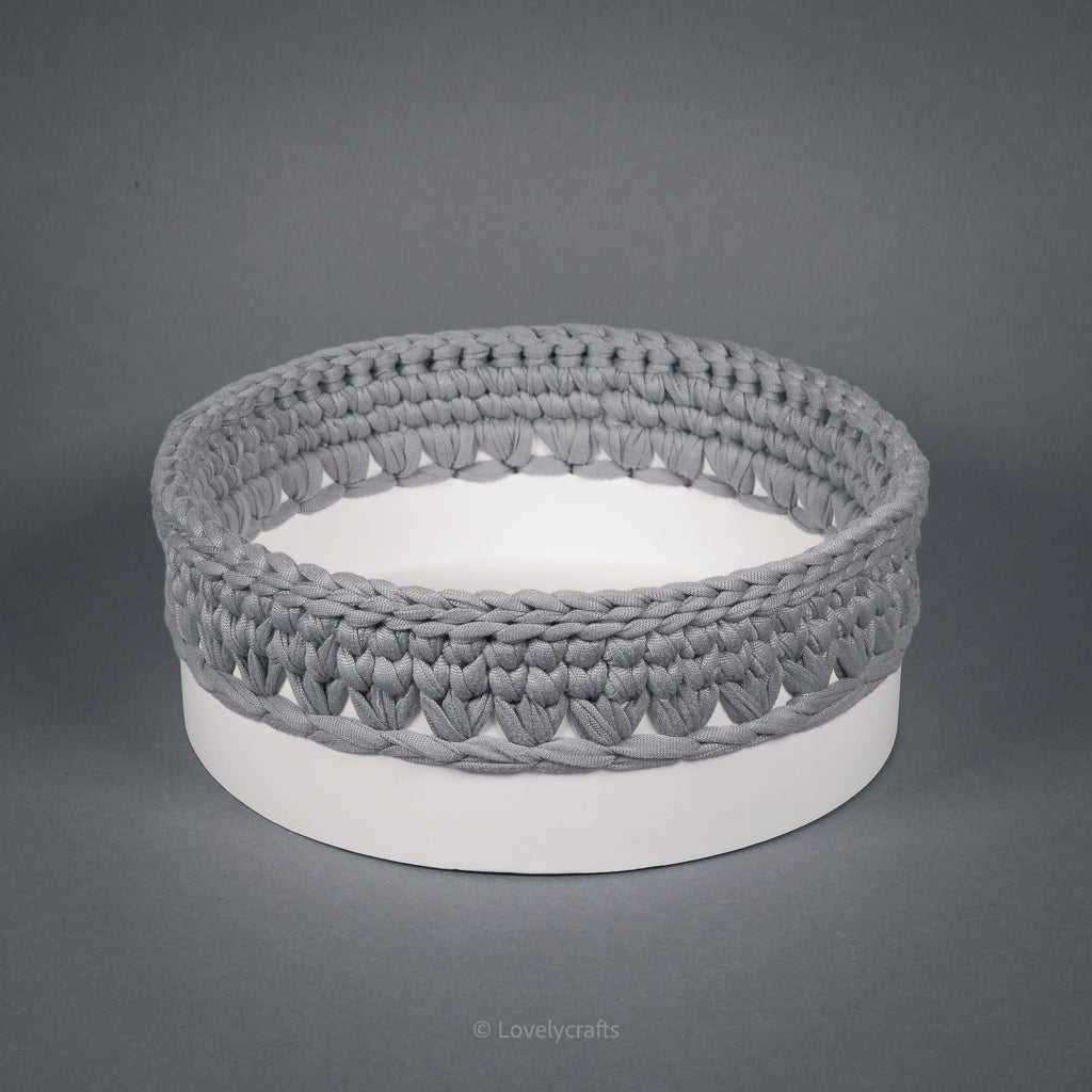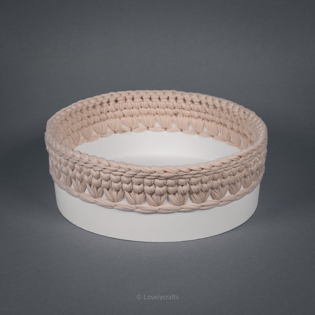 Gegossene Schale aus Raysin mit einem Häkelrand in braun oder beige. Glaszylinder und einer Kerze.